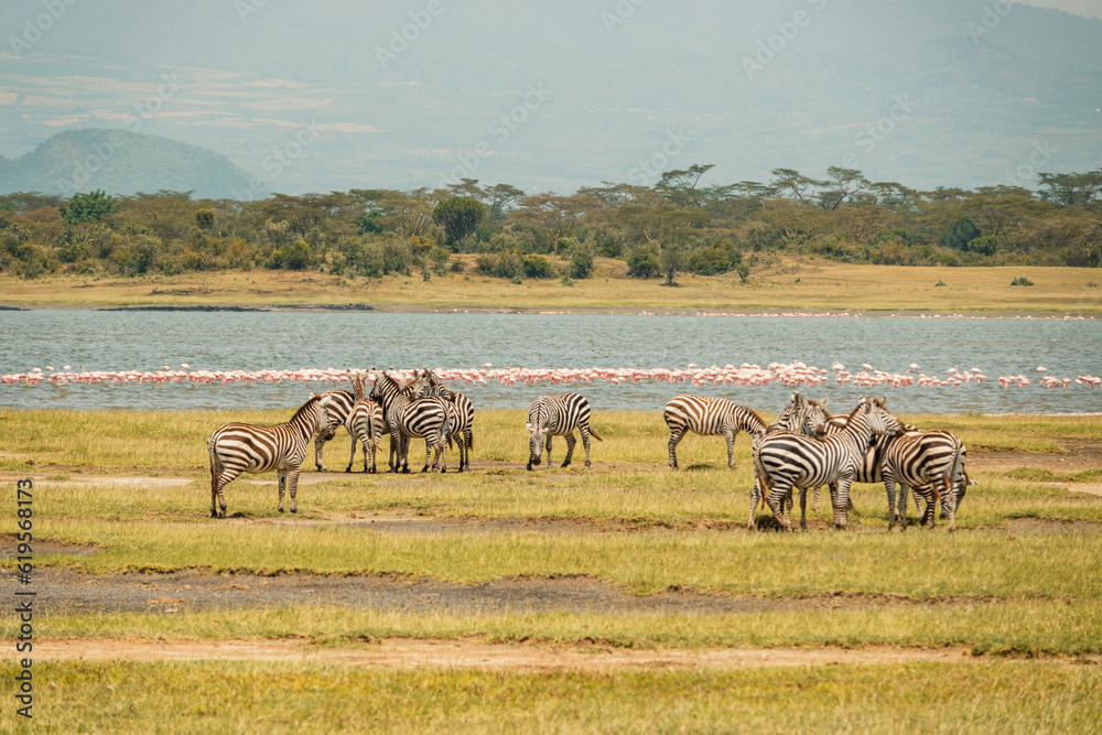 A herd of zebras grazing in the wild amidst flamingos at Lake Elementaita against the background of Sleeping warrior hill in Soysambu Conservancy, Kenya