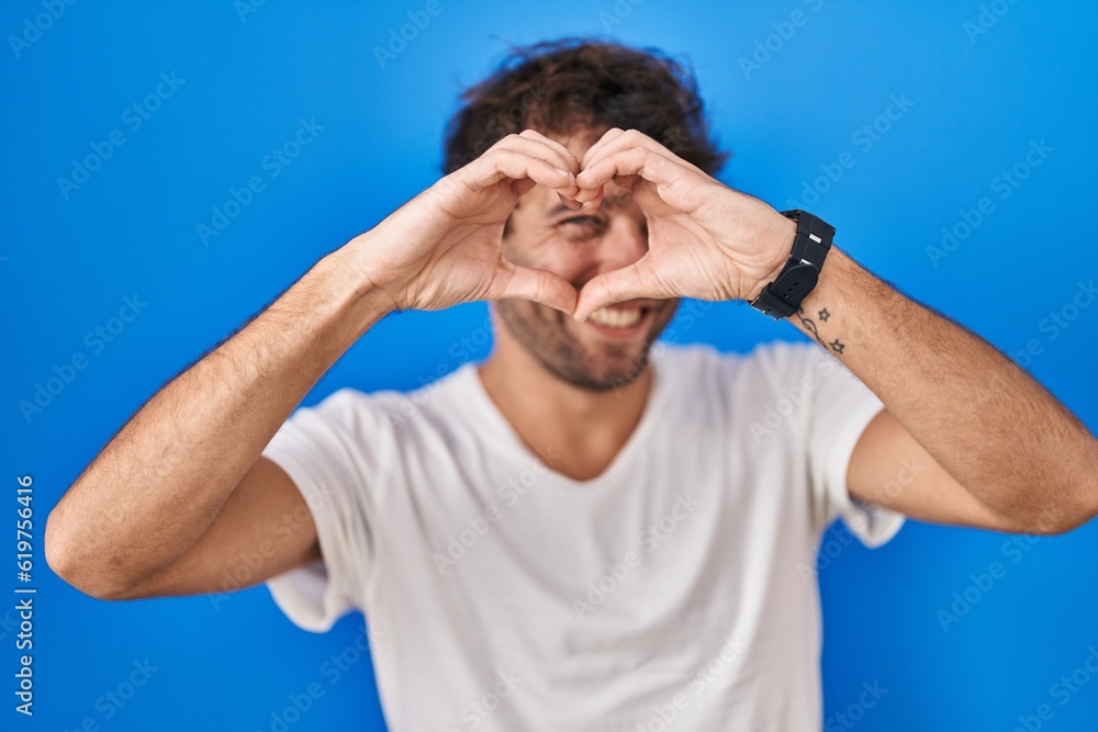 Hispanic young man standing over blue background doing heart shape with hand and fingers smiling looking through sign