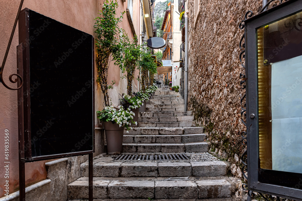A characteristic narrow alley of Taormina, Sicily, Italy