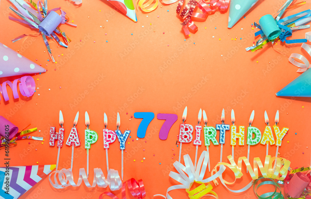 Top view birthday background with number 77. A beautiful holiday postcard on a colorful background with decorations. Anniversary congratulations with a number. Words from candles birthday.