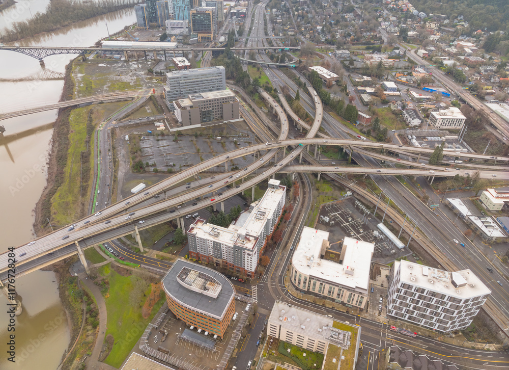 Los Angeles, California - June 29, 2023: Aerial drone photo around LA Koreatown near Western Ave and Pico Blvd with homes, houses with LA Downtown and LA Koreatown buildings