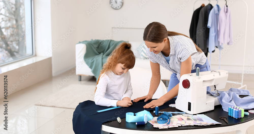 Little daughter helping her mother in tailor's workshop