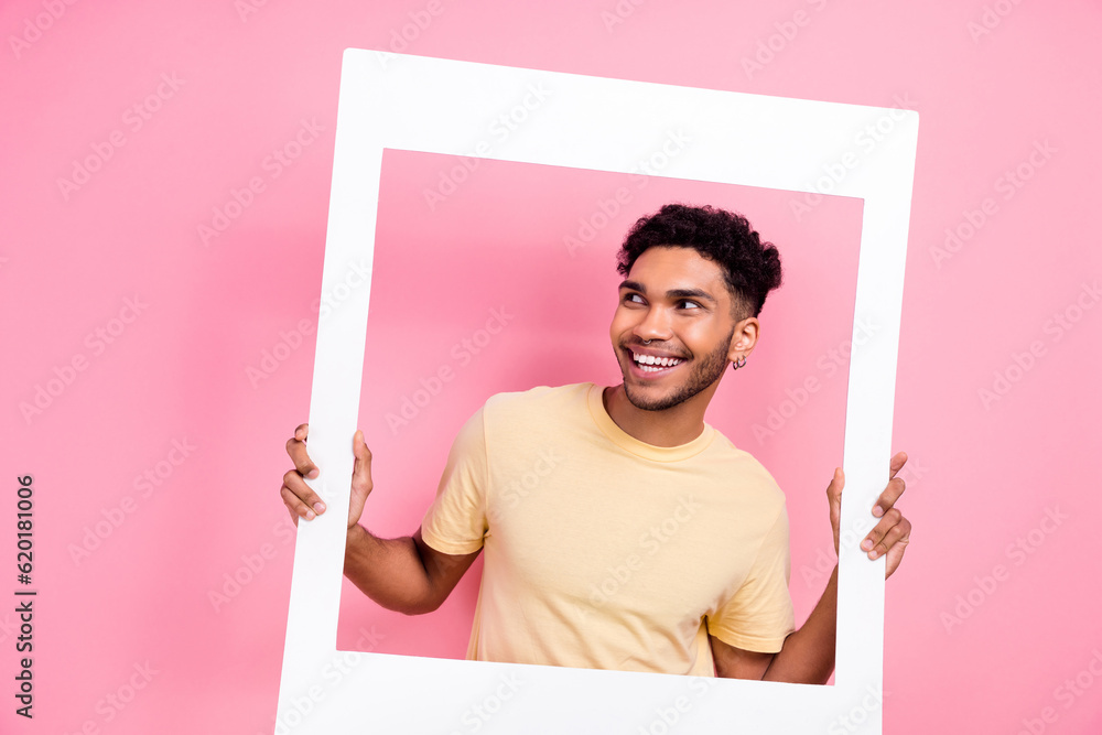 Photo of funny positive guy with afro hairstyle dressed yellow t-shirt look empty space hold photo frame isolated on pink color background