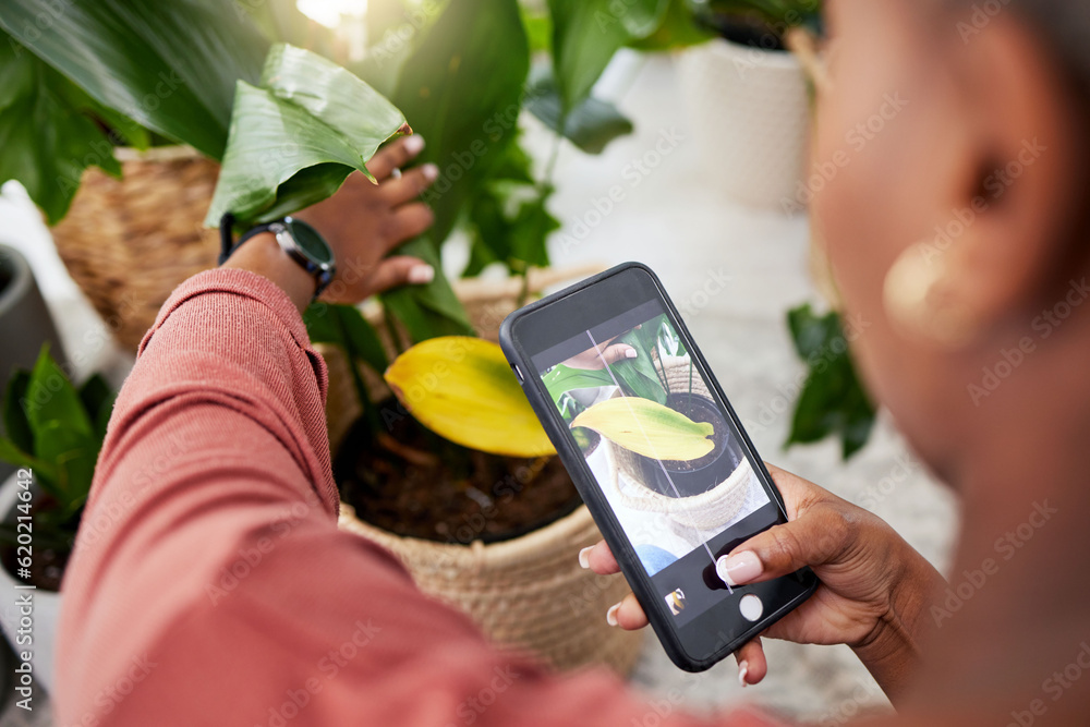 Woman, home and phone photography for leaves, gardening and health with care, check and analysis for growth. Girl, smartphone app and picture for sick plants, botany and ecology with tech in house