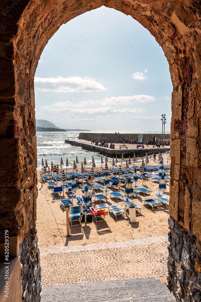Archway through an ancient stone building leading to a beach with unrecognizable people in Cefalu, Sicily, Italy