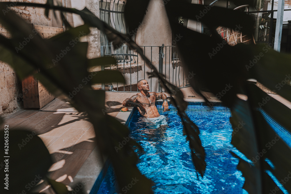Chico joven musculado y tatuado posando sin camiseta en piscina de estilo boho en un hotel un dia soleado de verano