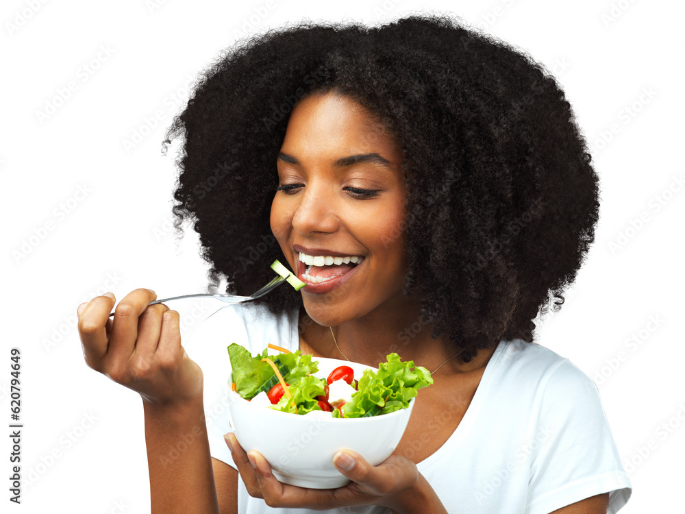 Salad, healthy eating and a woman with food for diet, weight loss and wellness. Black female model happy about vegetables or vegan meal and nutrition benefits isolated on transparent, png background