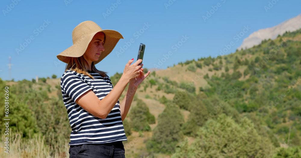 Woman photographer in hat with taking photo of mountains in Uzbekistan.
