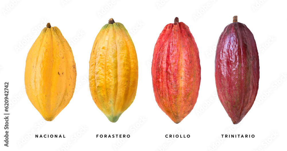 Variety of fresh cocoa pods isolated on white background. Clipping path.