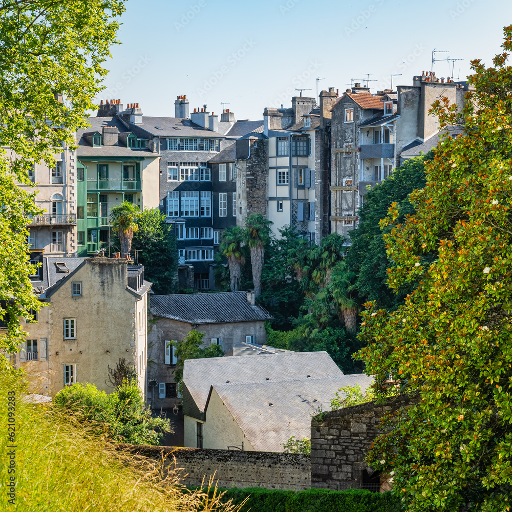 Buildings with picturesque facades by the river in the medieval city of Pau, France.