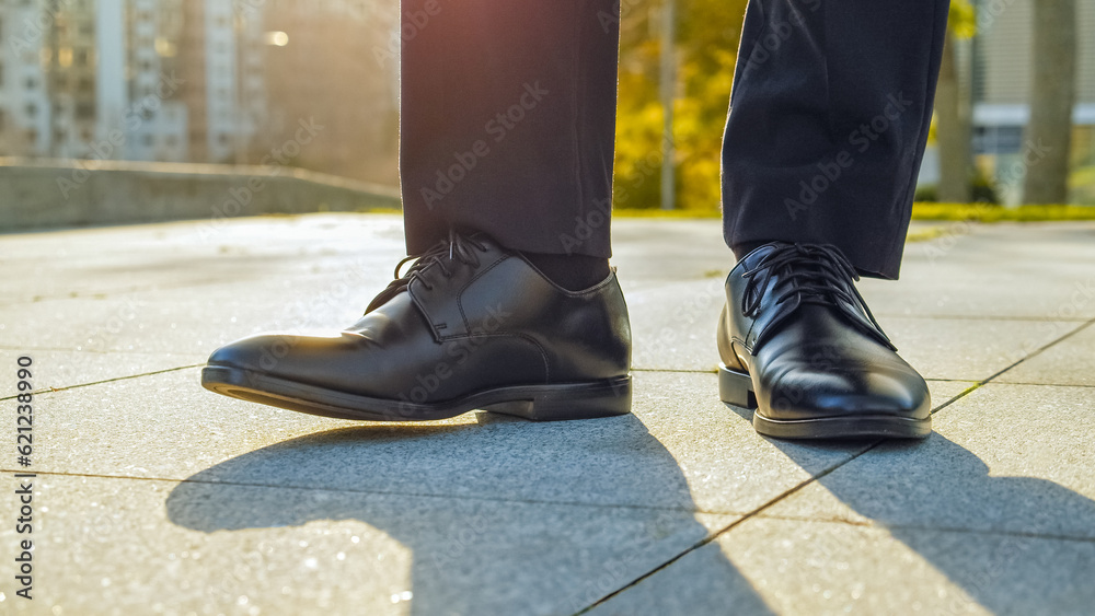 Close-up view to the businessman in a black new classic shoes outdoors. Legs of a businessman in fashionable glossy shoes. Business concept. Stylish men wears. Low angle. Sun flares behind the legs