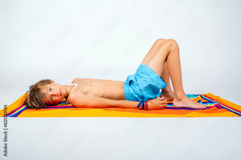 Young shirtless preteen boy in swim trunks lying down on a colorful beach towel