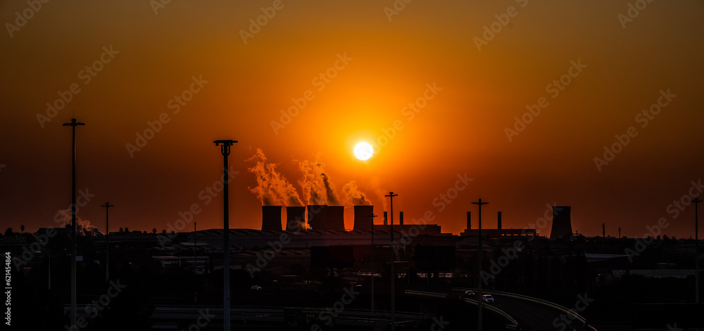 A coal fired power station contributing to pollution before sunset with light poles in foreground