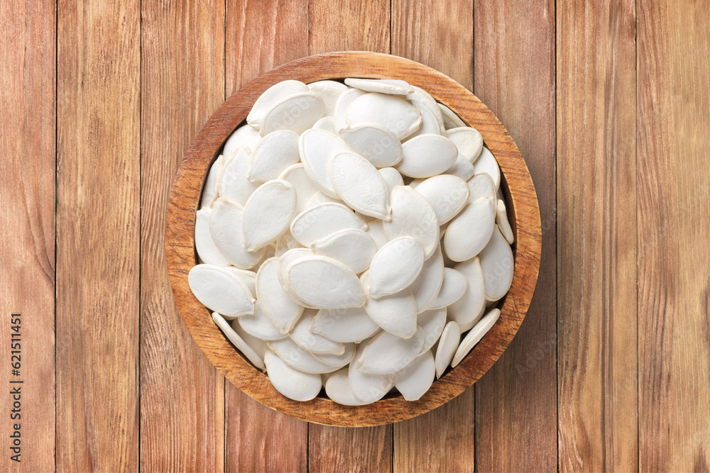 pumpkin seeds in bowl on wooden table background, top view. organic vegetarian food.