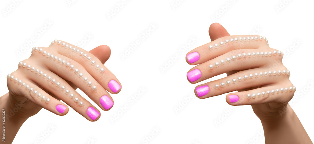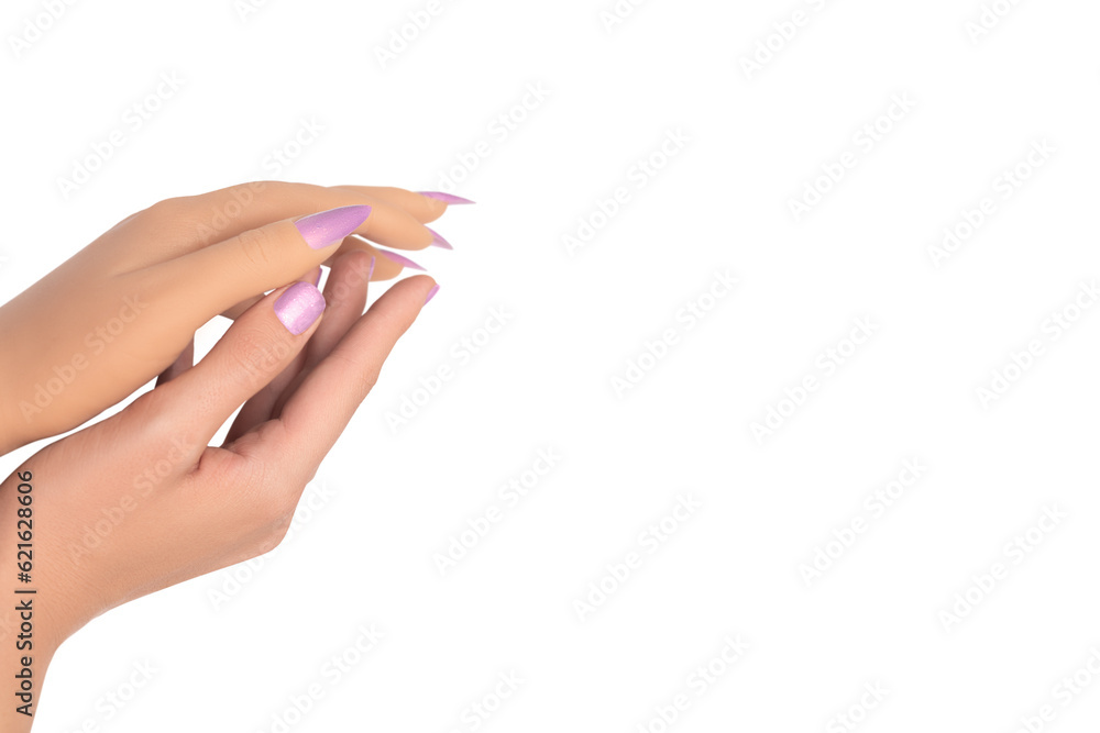 Female hands with green nail design. Green nail polish manicure. Hands with green manicure on green background.