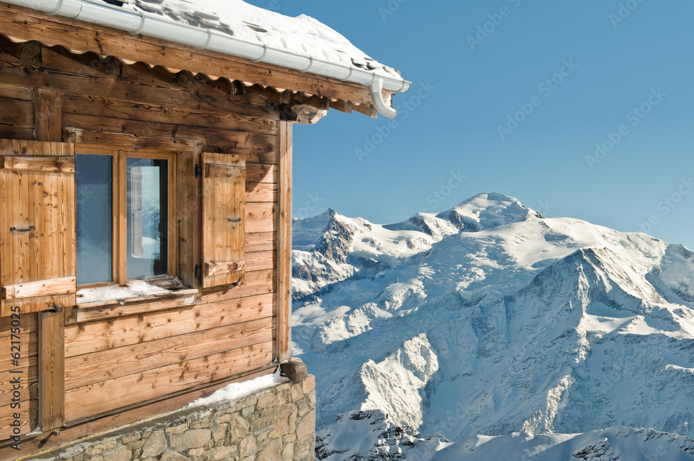 view on a snowy montainand blue sky from a cottage