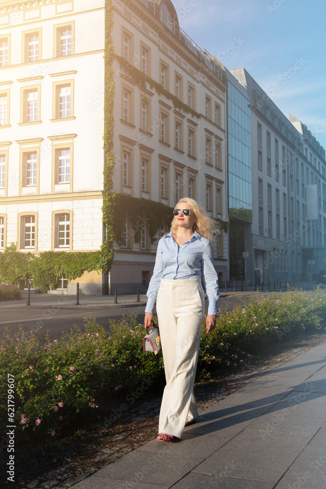 a stylish, positive woman in trousers and a shirt walking down the street near a European building. a warm summer day