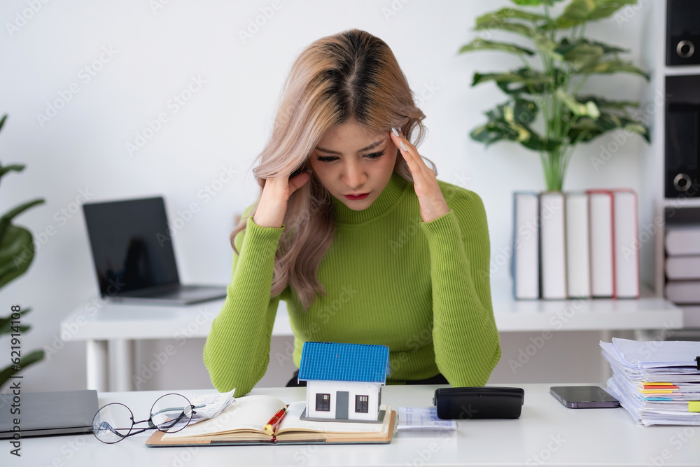 oung Asian woman sitting and calculating expenses and mortgage with calculator and house on table Worried about payments and non-repayable loans, business, and property