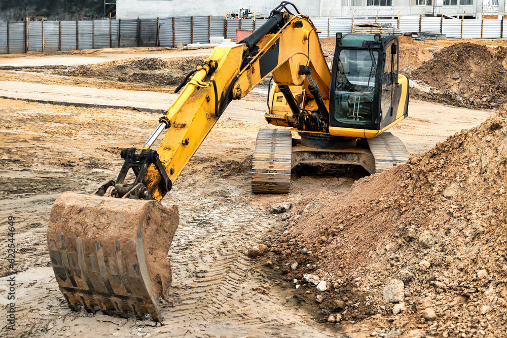 Large crawler excavator at the construction site. Close-up of an excavator bucket with the boom extended. Rental of construction equipment. Earthworks in construction.