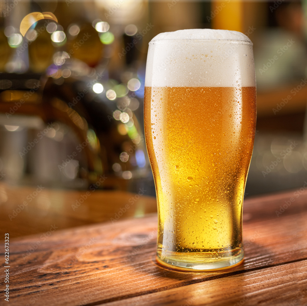 Glass of chilled beer on wooden bar table top and blurred bar interior at the background.