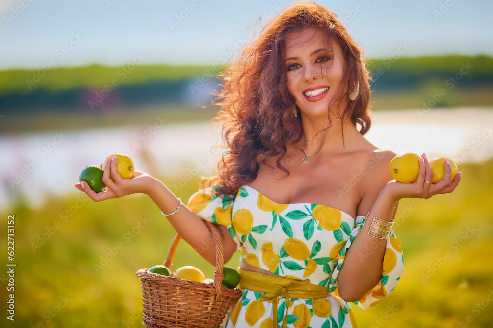 portrait of a beautiful woman with lemons on a meadow near a lake.