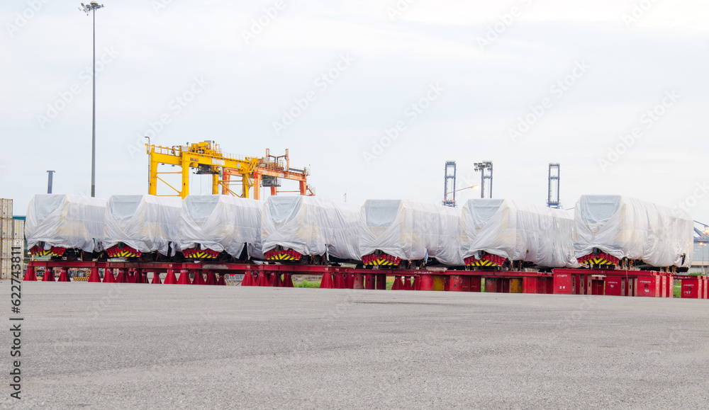 Transport of Oversize Heavy Machinery cargo truck Loading a new locomotive port area