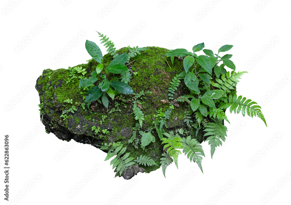 Tropical plant stone rock fern moss bush tree isolated on white background with clipping path.