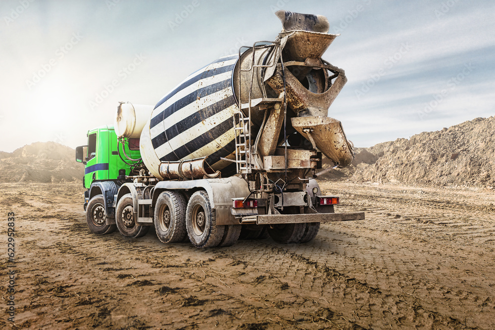 A large concrete mixer truck brought concrete to the construction site. Powerful modern machinery for construction work. Construction site. Rental of construction equipment.
