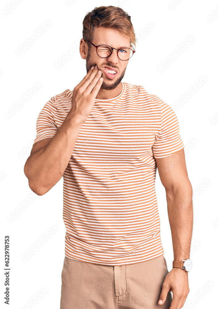 Young caucasian man wearing casual clothes and glasses touching mouth with hand with painful expression because of toothache or dental illness on teeth. dentist