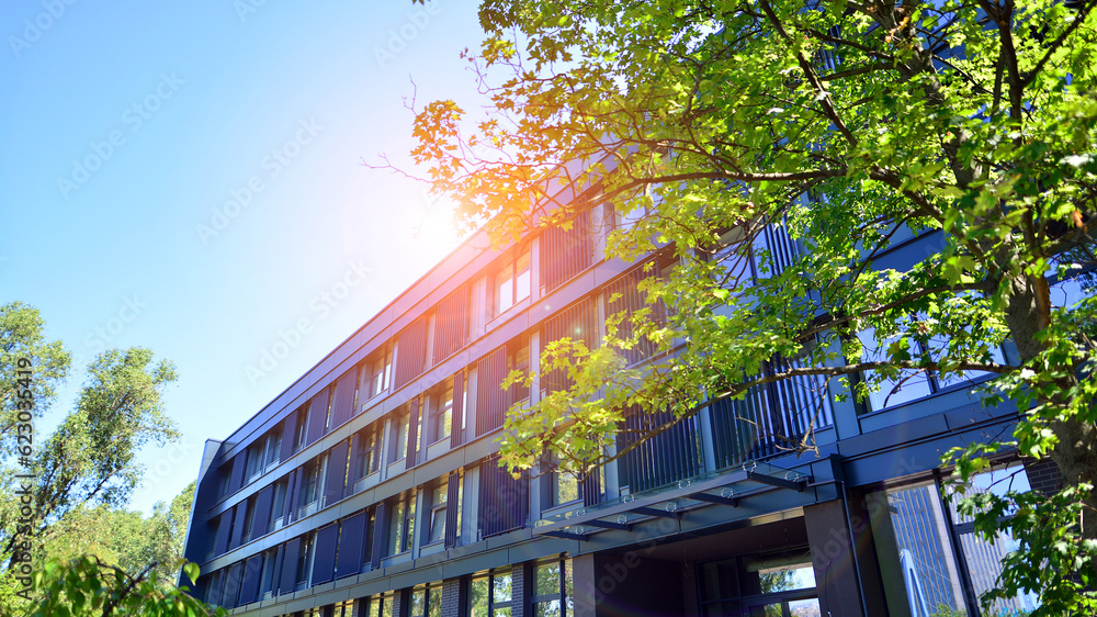 Sustainable glass office building with trees for reducing carbon dioxide. Eco-friendly building in modern city. Office with green environment. Corporate building reduce CO2.