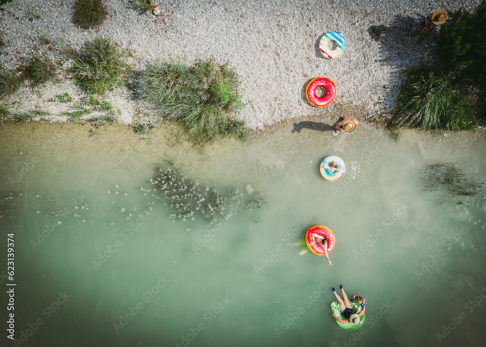 Image of family enjoying swimming in a river. Over head drone shot, colorful, fun, outdoors.