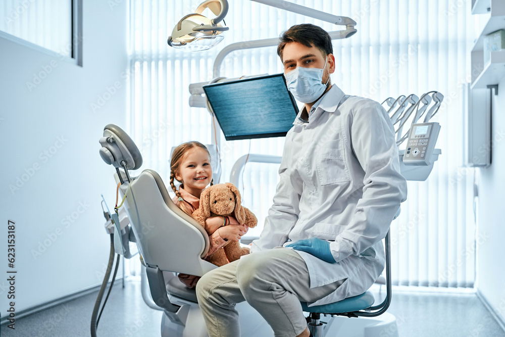 Children's dentistry.Portrait of a dentist doctor in a medical gown and mask sitting and in the background a little female patient sitting in a chair and holding a toy.