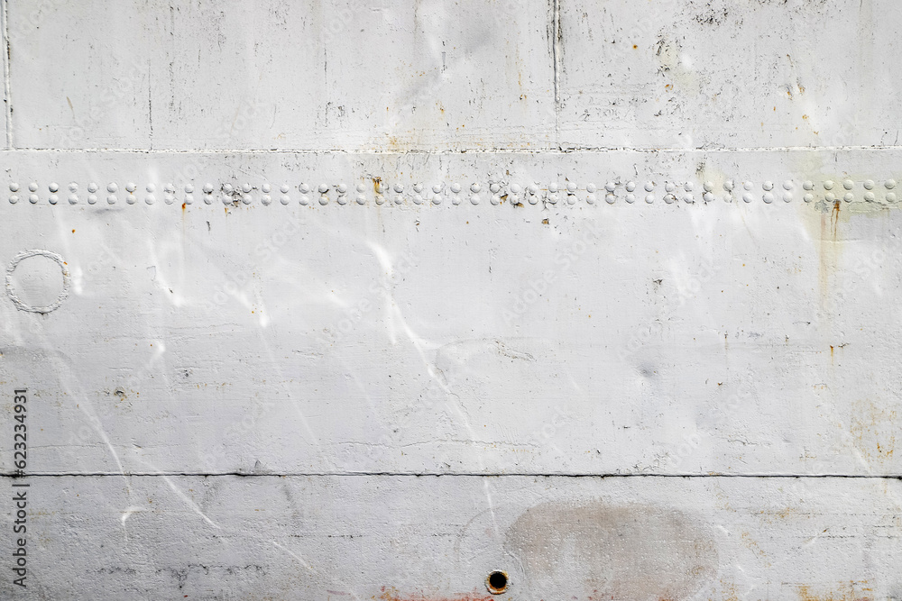 Riveted with button-head rivets metal plate - side of a sea vessel - painted in white as a background