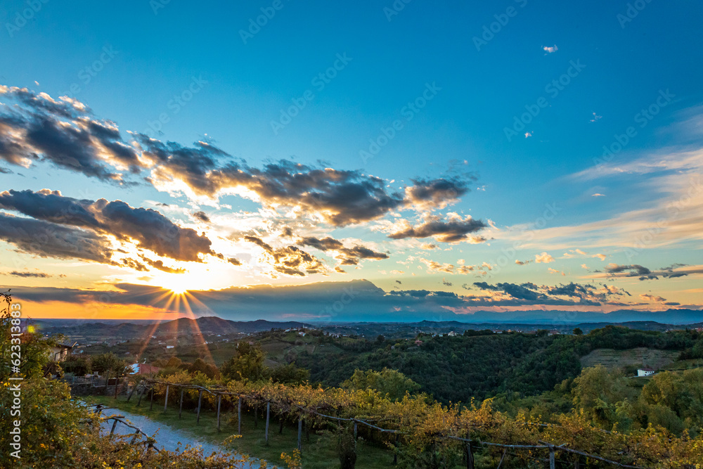 Colorful sunset in the vineyards at the border between Italy and Slovenia