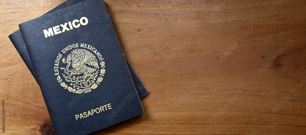 Bird's-eye view of two Mexican passports on a wooden table, copy space.