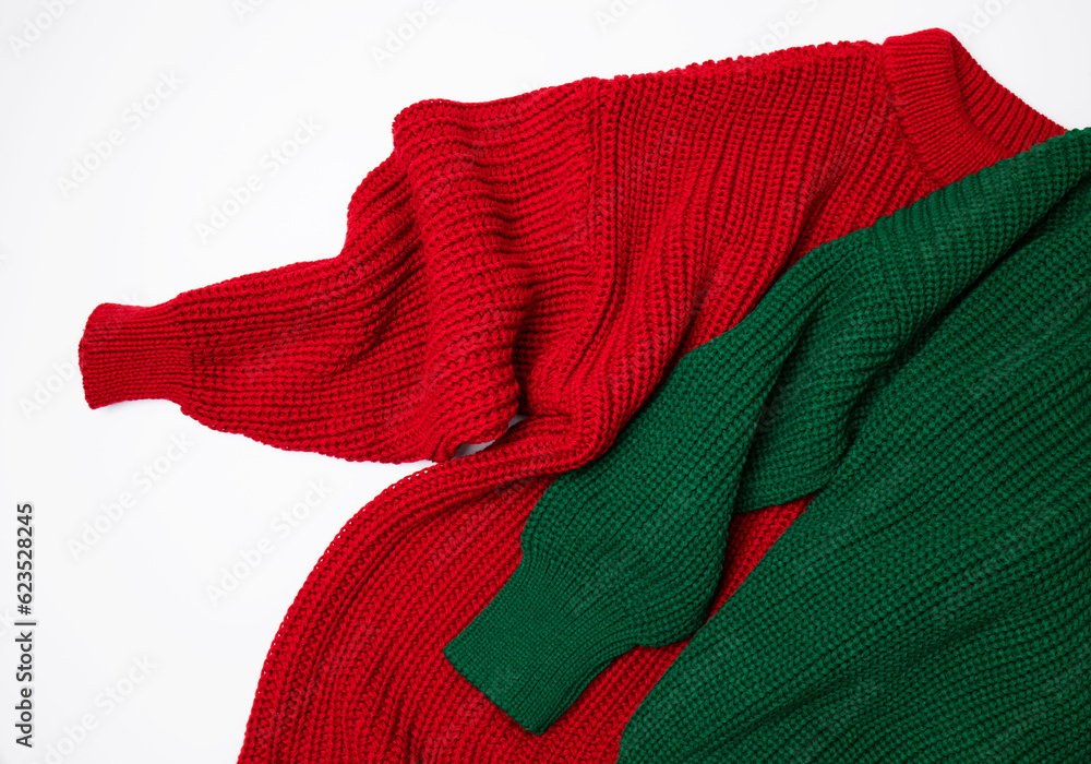 Red and green knitted sweater on white background top view. Texture of woolen cotton winter autumn cozy sweater, clothes. Knitted jumper, pullover, fashion