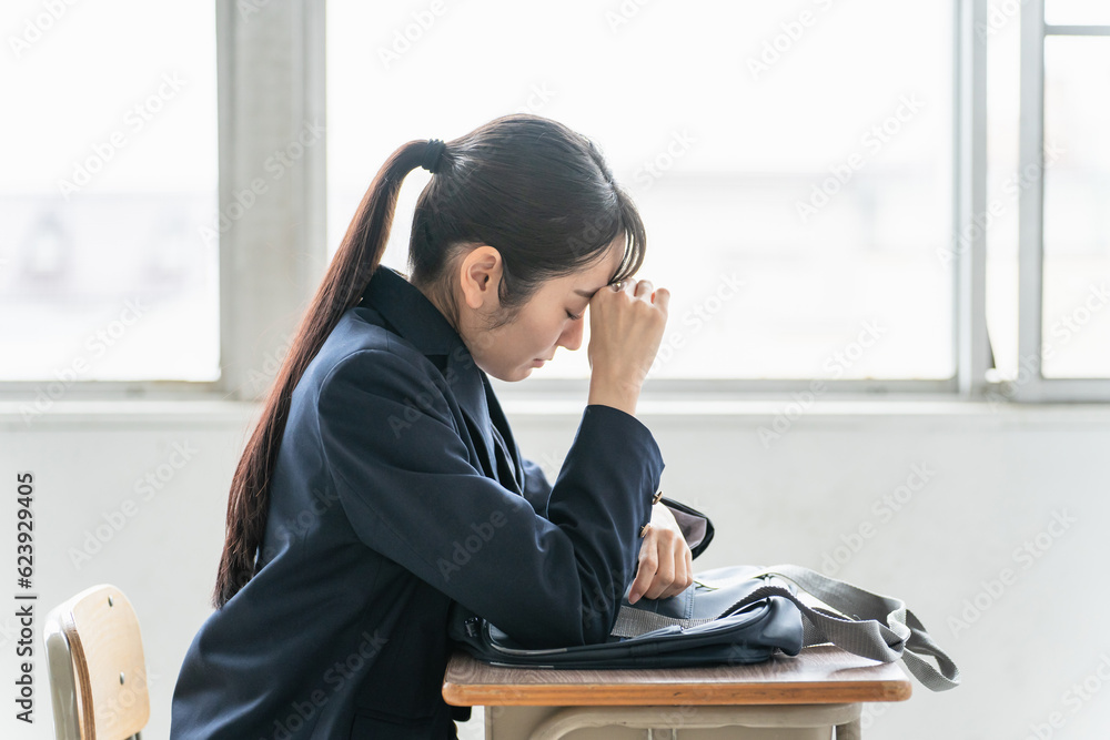 学校の教室で女子高校生・中学生が俯いて悩んでいる(悩む・困る・ストレス)