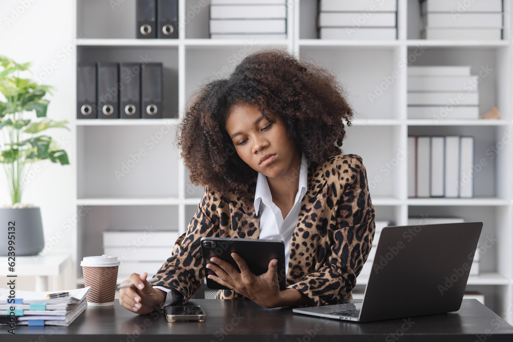 Young African American businesswoman are stressed and tired from work sitting at desk in the office, feeling sick at work, stress from work.