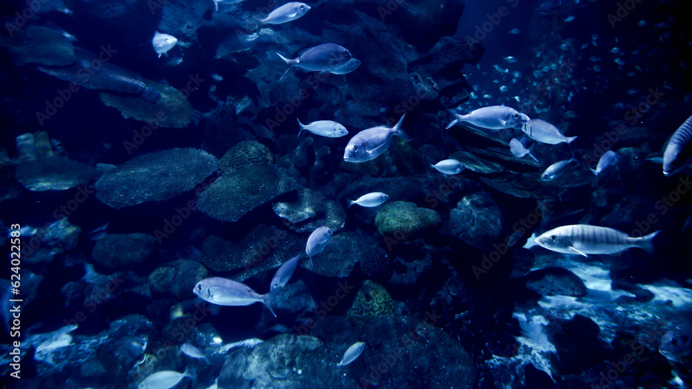 Beautiful underwater view on sea bottom with lots of fishes, weeds and coral reefs. Abstract underwater background or backdrop