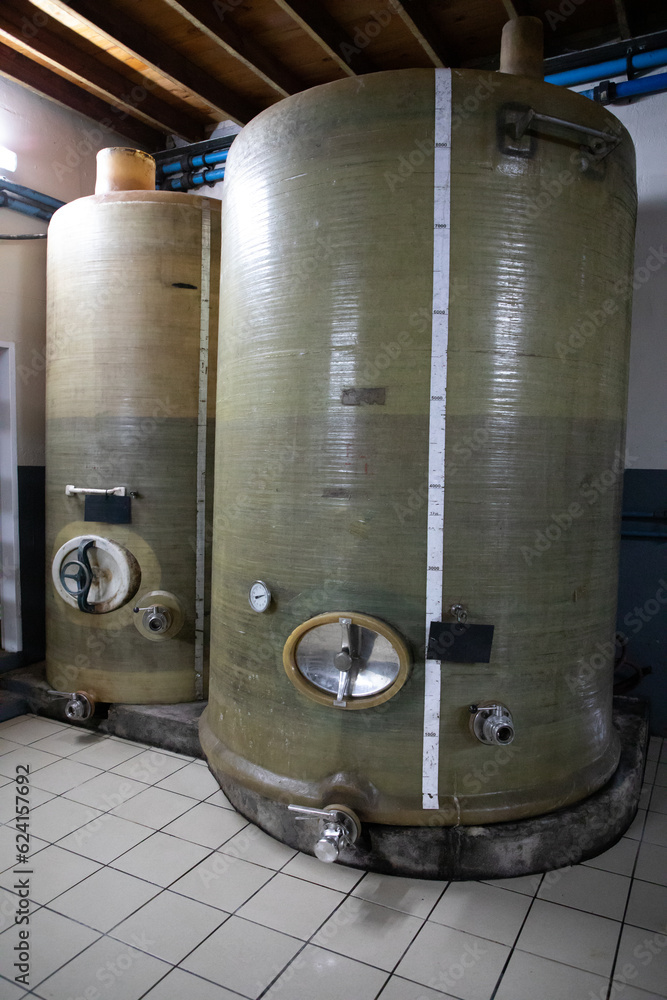 Two large plastic storage tanks used in the production of wine making. The tanks are half filled with red wine.