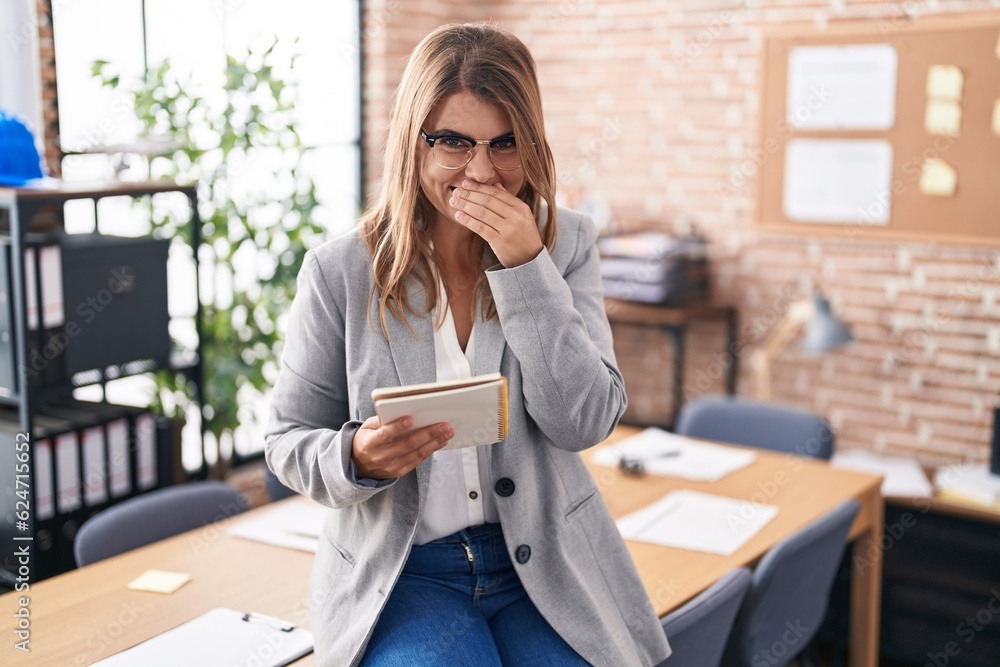 Young hispanic woman working at the office wearing glasses laughing and embarrassed giggle covering mouth with hands, gossip and scandal concept
