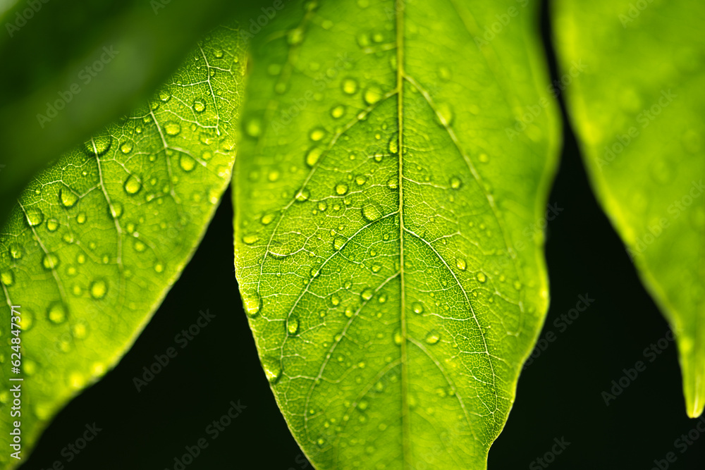 Closeup shot of a water drops on green leaves in summer rainforest. Floral texure. Macro photography. Nature concept background