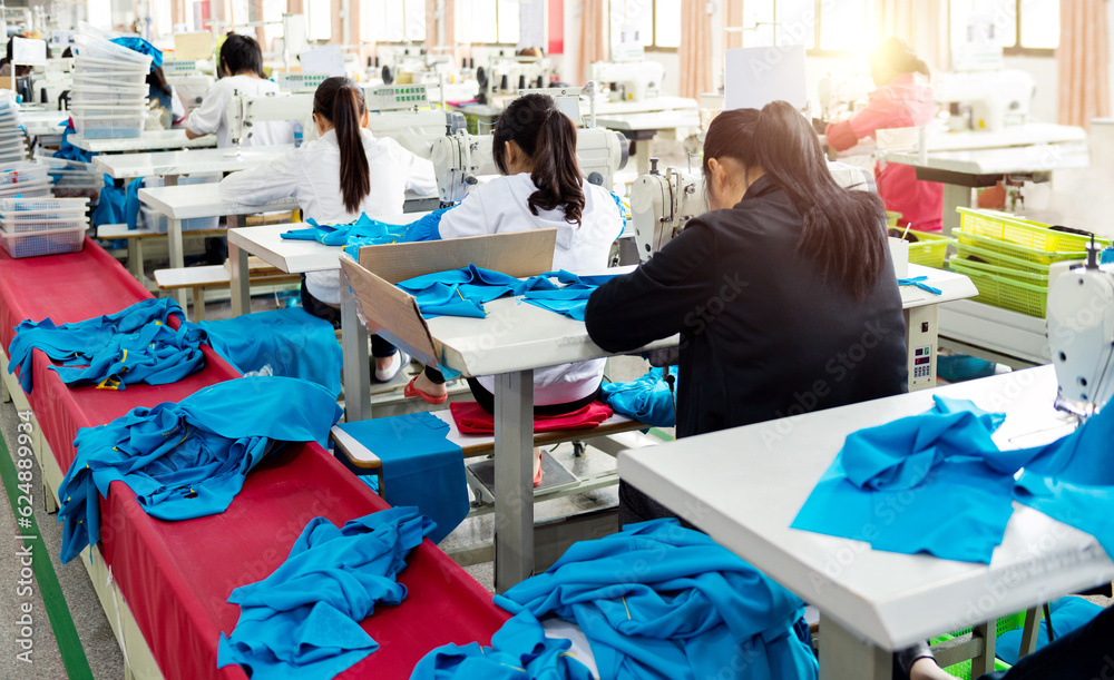 Rear view of chinese female blue collar workers working in clothing factory in a row