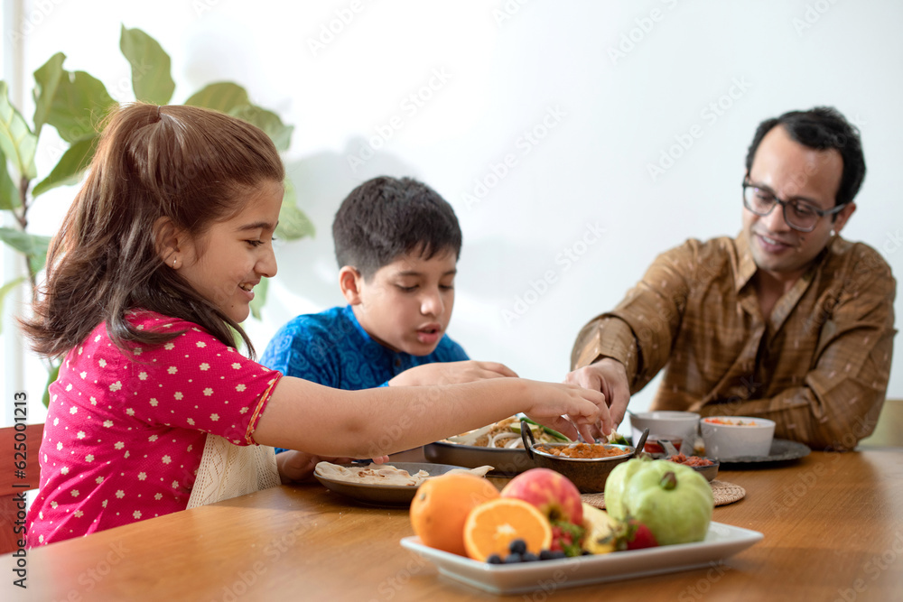 Happy Indian father with daughter and son having meal at home, family in traditional dress tasting Indian food, selective focus
