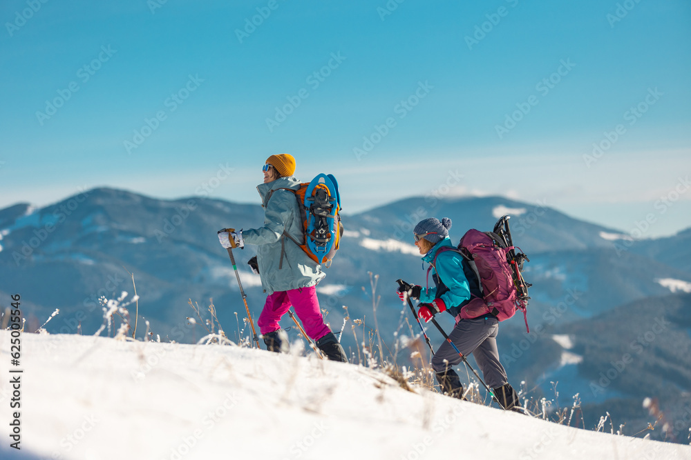 Tourists travel together in the mountains in winter. two girls snow-capped mountains.