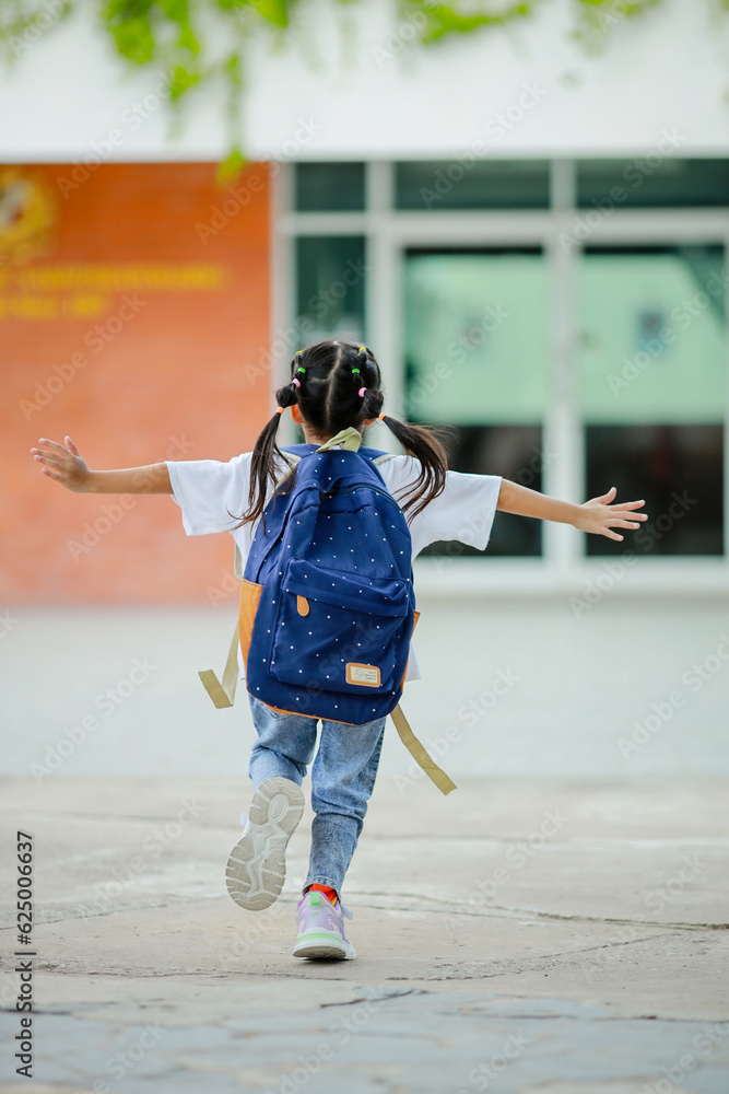 Little kid girl asian with a backpack going to school with fun. which increases the development and enhances the learning skills. Concept Back to school.