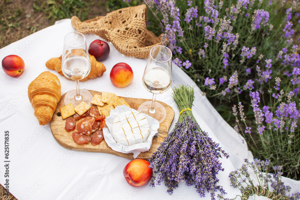 A summer picnic in a lavender field with croissants, peaches, salami, cheese and a bottle of wine and glasses.