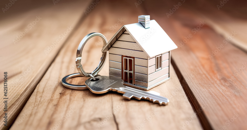House keys with house shaped keychain on wooden background. House key on a house shaped keychain resting on wooden floorboards concept for real estate, moving home or renting property