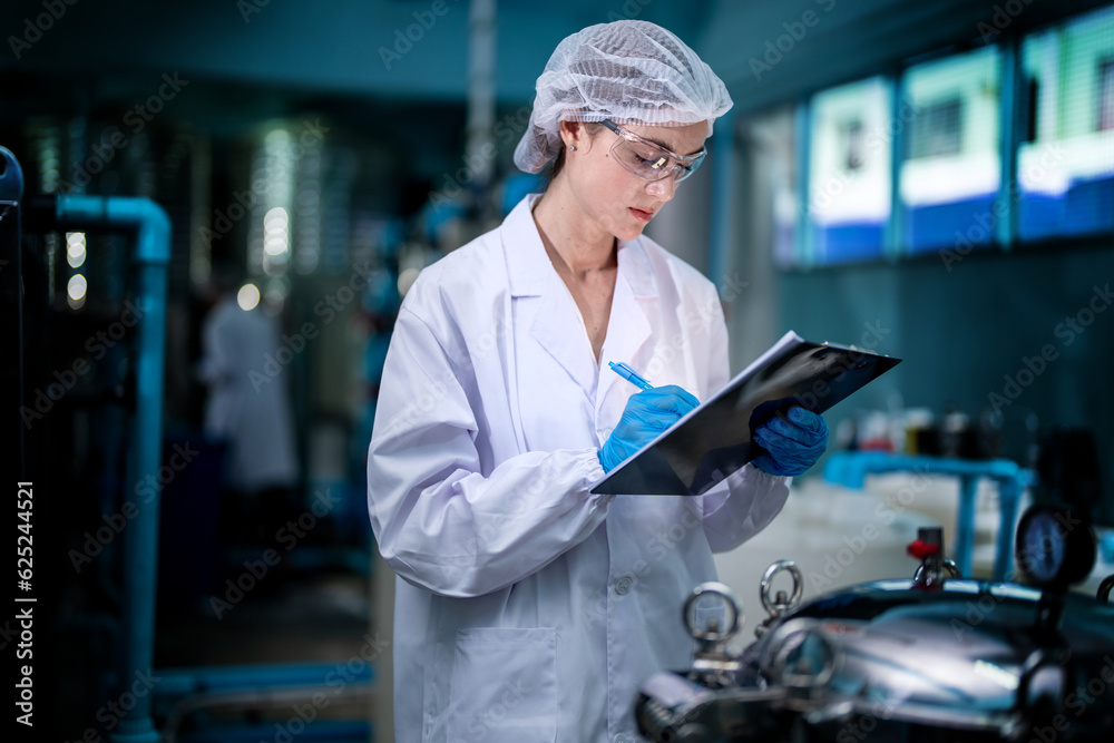 Factory worker checking water bottles in the warehouse at the industrial factory. Female worker recording data at the beverages manufacturing line production.