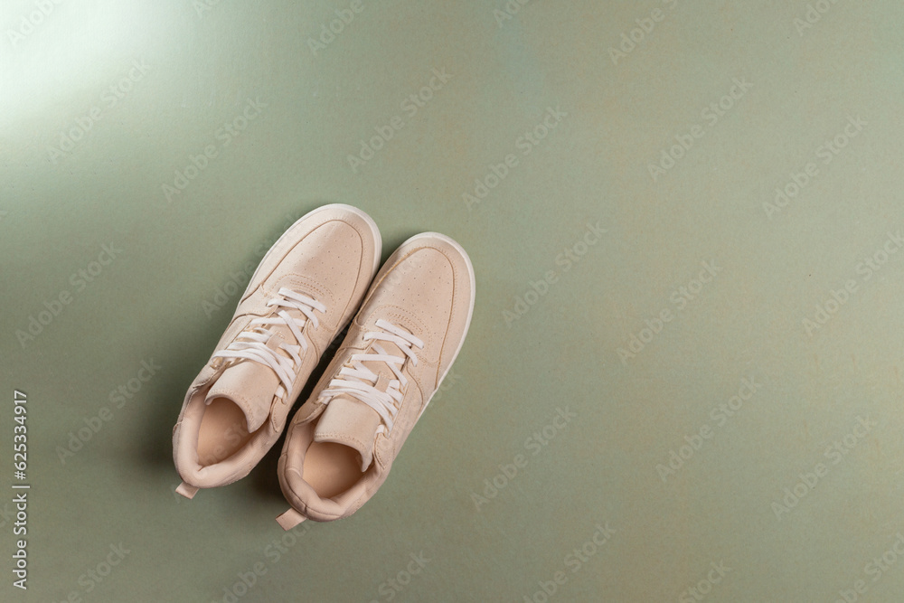 Classic hipster biege sneakers on green background, active lifestyle. Summer concept. top view